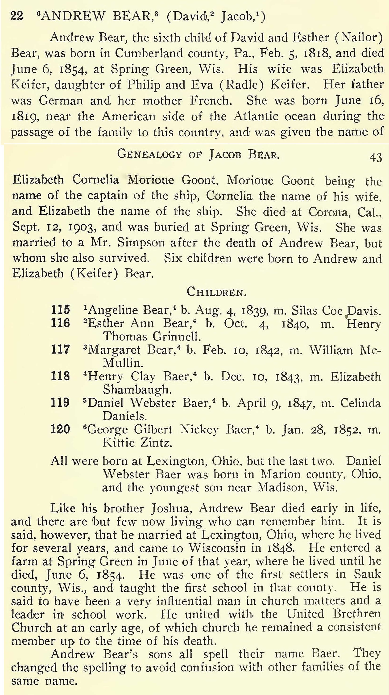Children of Andrew Bear and Elizabeth Cornelia Morione Goont Kiefer