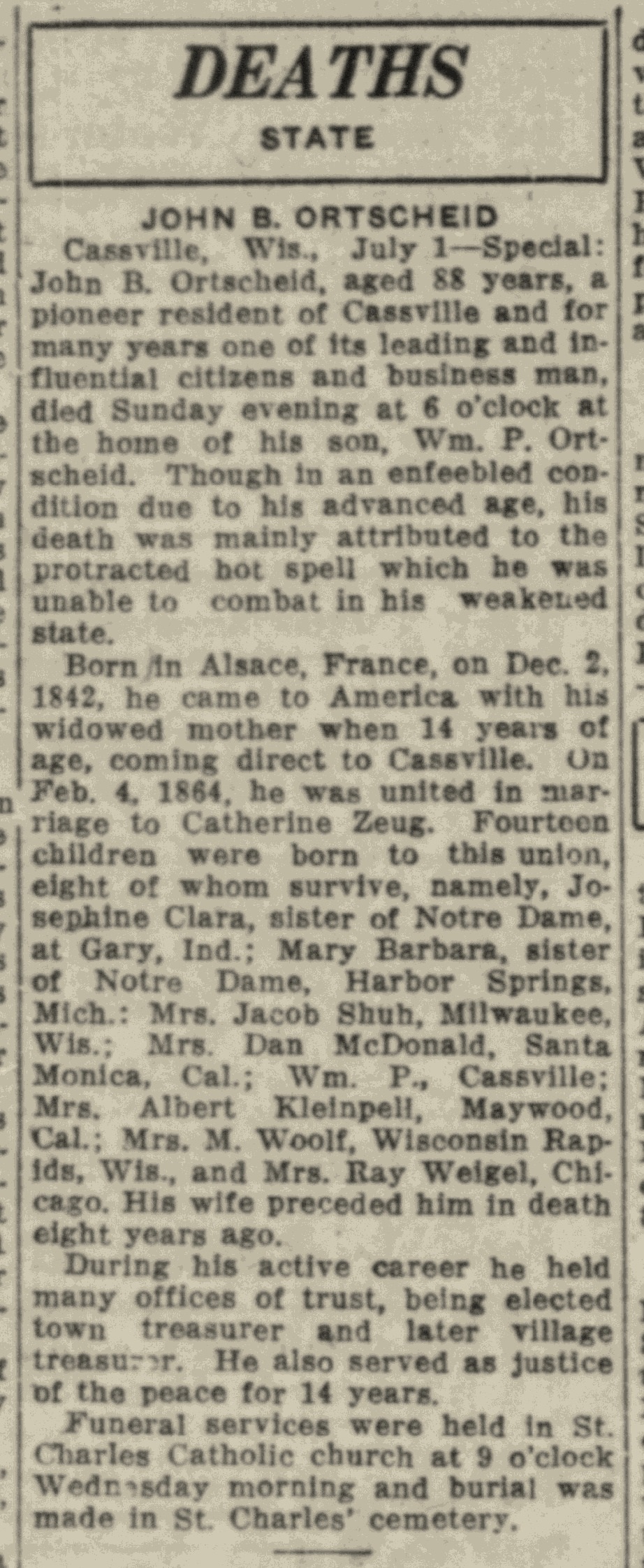 | Father* | John Baptists Ortscheid b. 2 Dec 1842, d. 7 Jun 1931 |