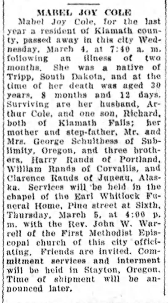 - Mabel Joy Rands+ b. 21 Jun 1905, d. 4 Mar 1936