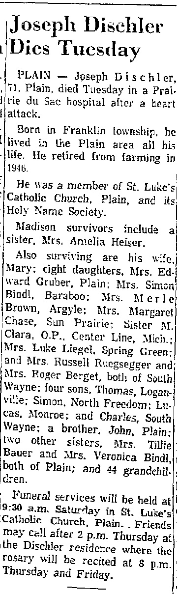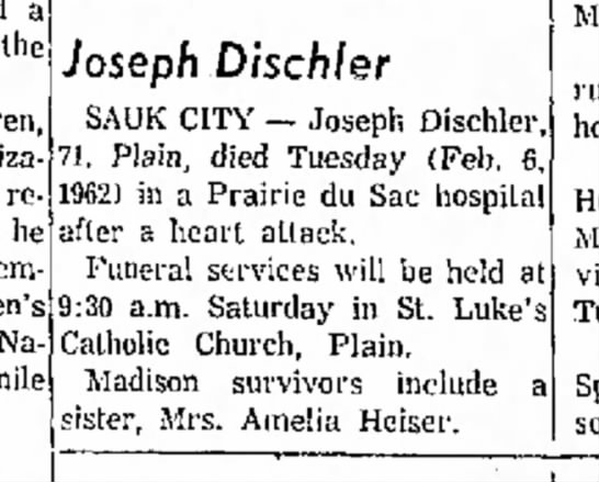 | Father* | Joseph Dischler b. Jul 1890, d. 6 Feb 1962 |