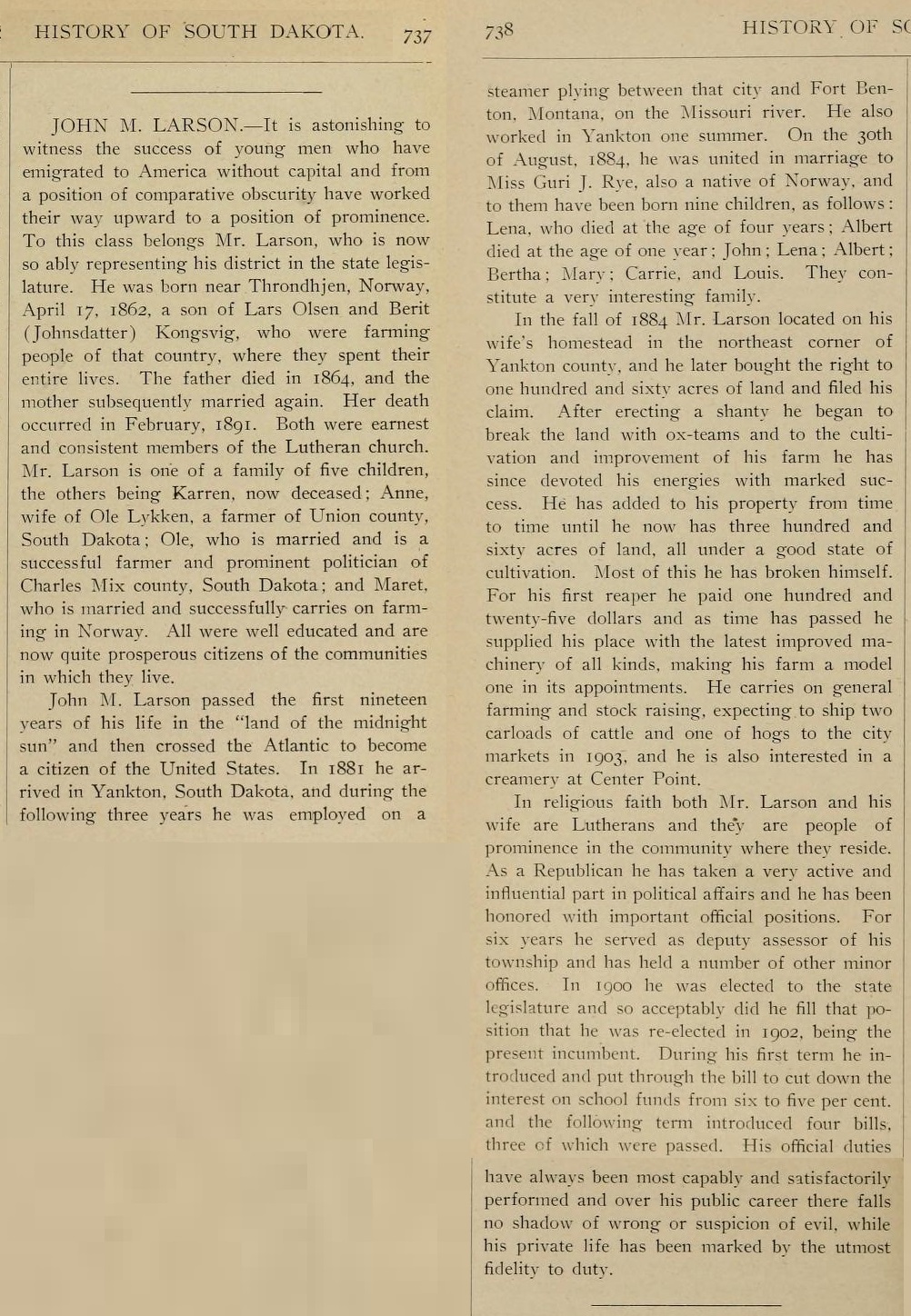 - [S21] Doane Robinson, History of South Dakota Volume 1, Pg 737-738.