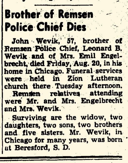 - Alfred O. Wevik+ b. 24 Jul 1887, d. 17 May 1948