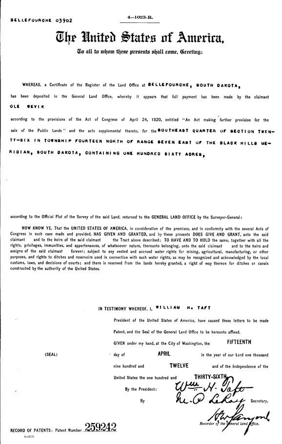 The index was compiled by Joy R. Fisher Std Atlas of Union Co, SD, pg 27. - [S261] Land Office Records Land Patent Record, by Bureau of Land Management, Accession/Serial #: 259242 BLM Serial #: SDBF 0003902.