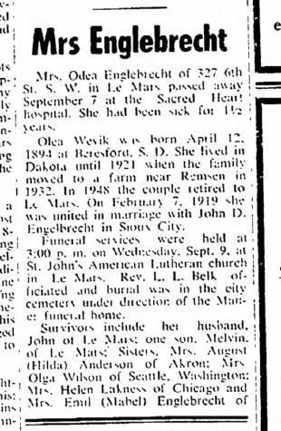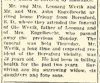 - Ole O. T. Wevik+ b. 9 Mar 1907, d. 6 Aug 1974