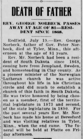 - Governor Peter R. Norbeck+ b. 27 Aug 1870, d. 20 Dec 1936