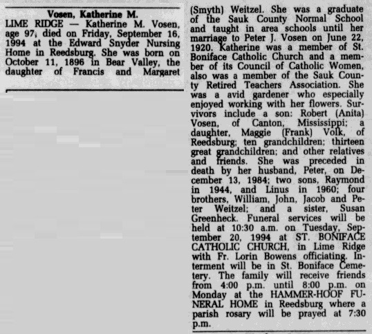 - [S373] U.S. Federal Census 1940 U.S. Federal Census, by Ancestry.com, Year: 1940; Census Place: Franklin, Sauk, Wisconsin; Roll: T627_4523; Page: 11B; Enumeration District: 56-14.