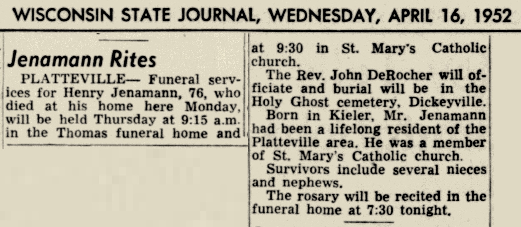 - Henry Jenamann b. Apr 1875, d. Apr 1952