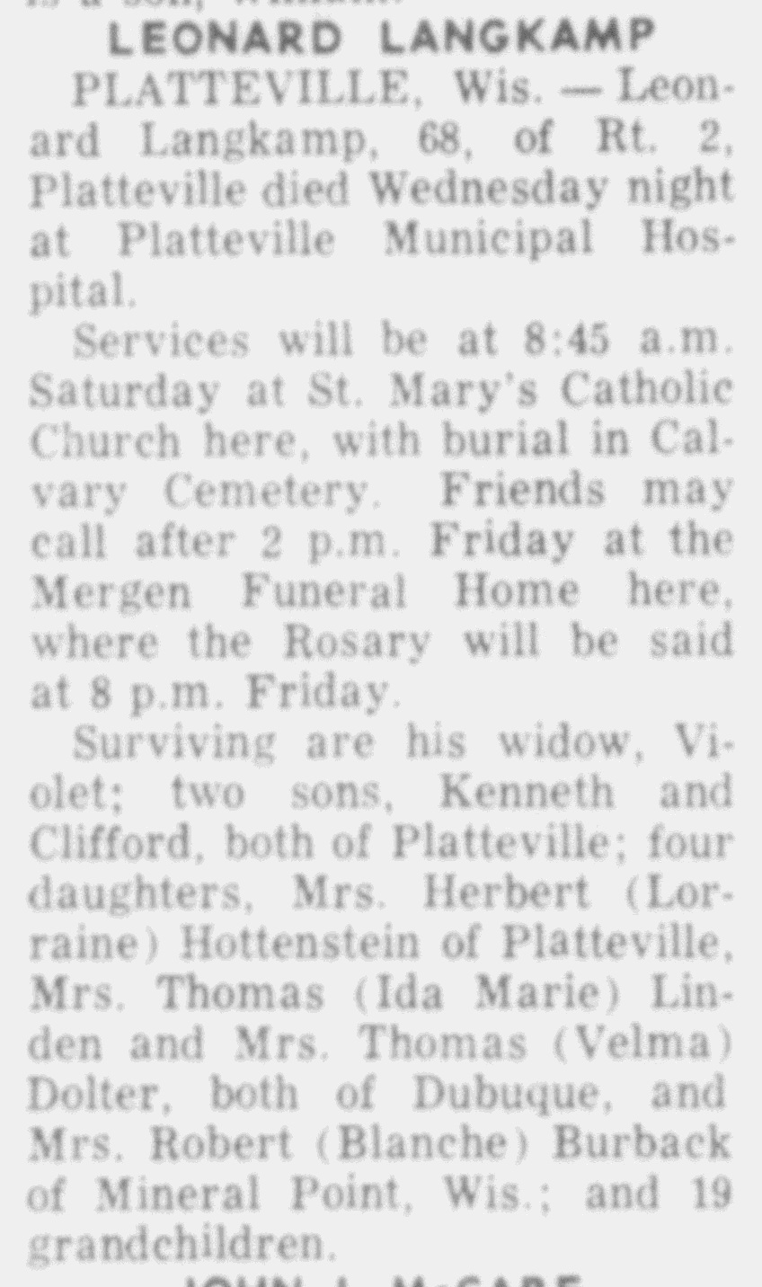 - Leonard Clarence Langkamp+ b. 24 Aug 1926, d. 2 Jul 2008