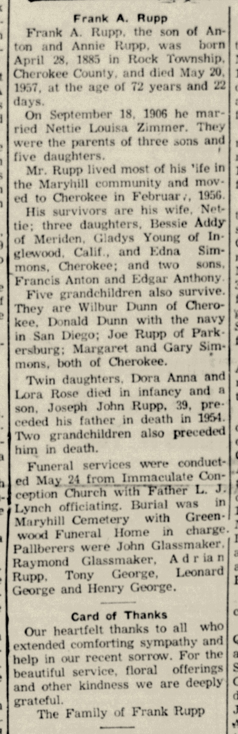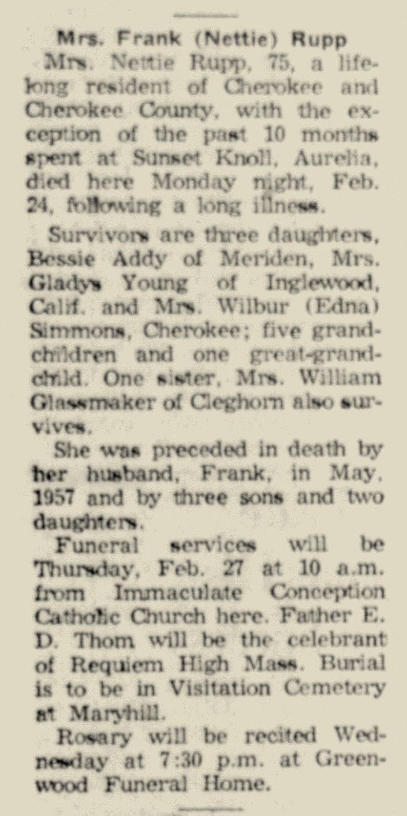 - baby girl Rupp b. 23 Feb 1937, d. 24 Feb 1937