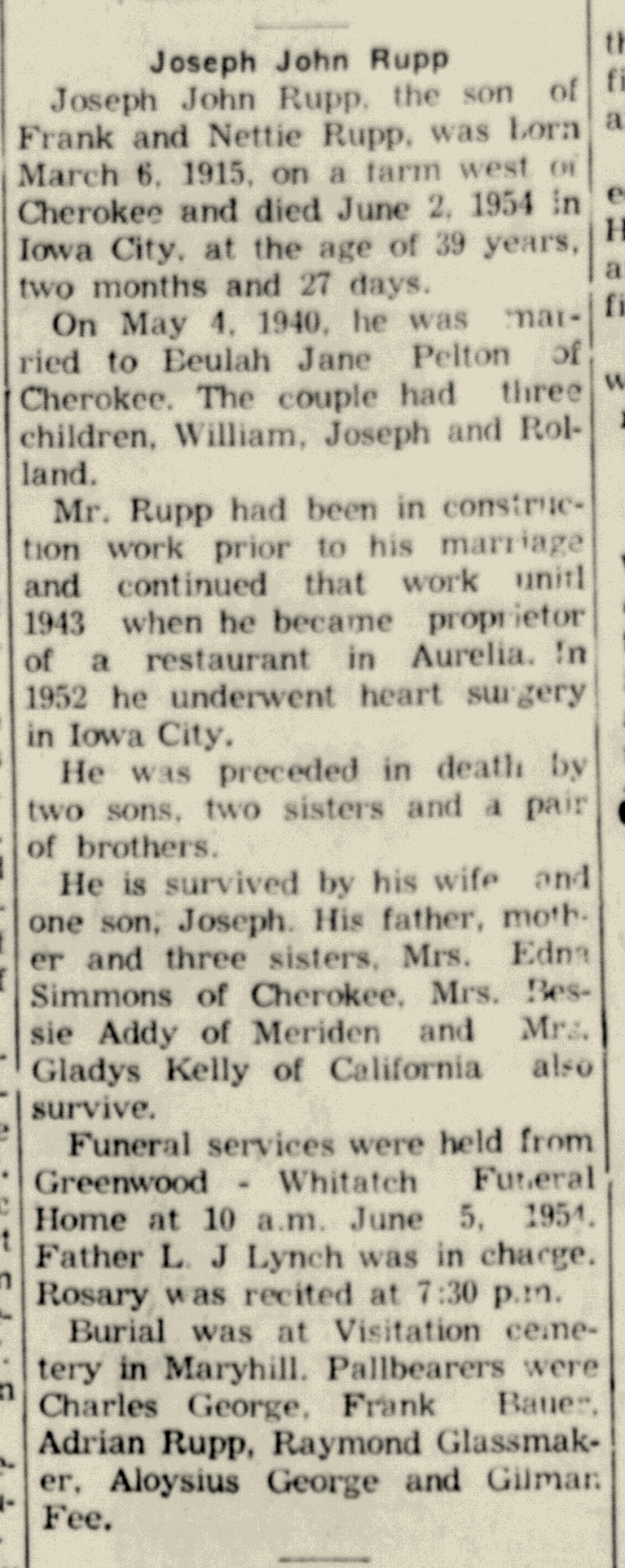 - Joseph John Rupp+ b. 6 Mar 1915, d. 2 Jun 1954