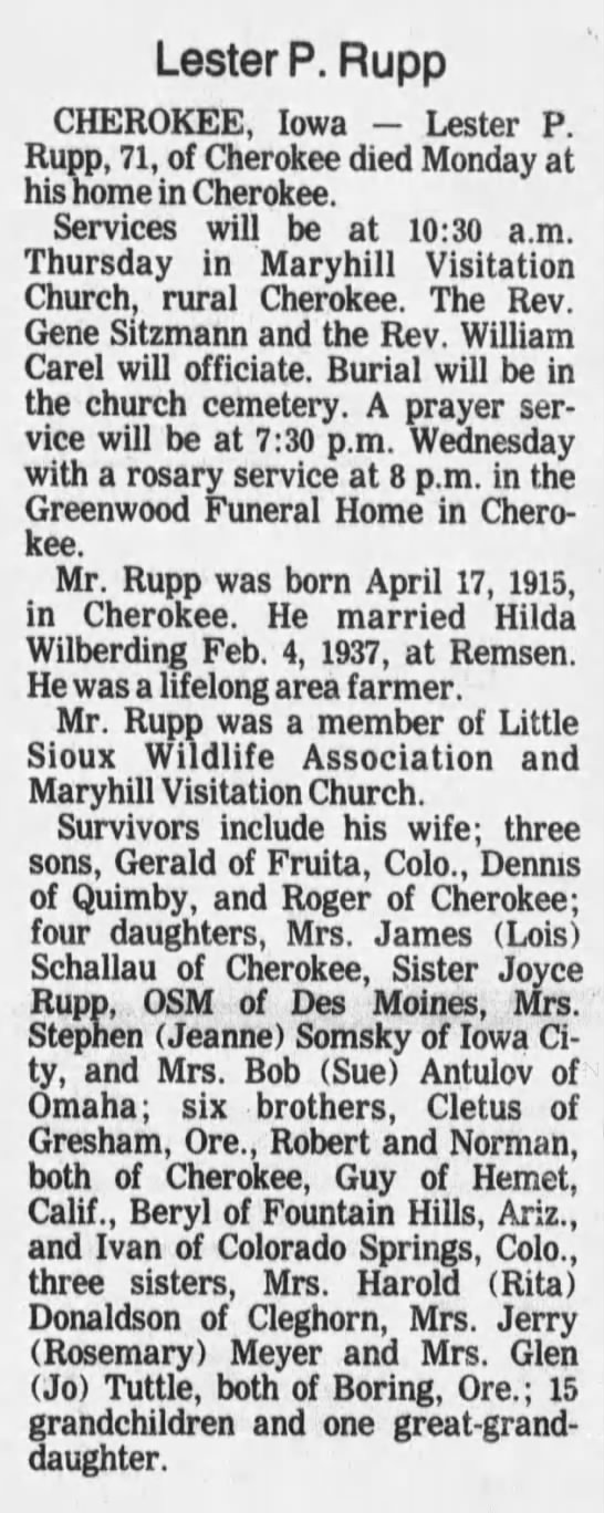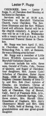 - Wilmer John Rupp b. 19 Aug 1920, d. Aug 1983