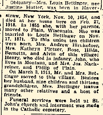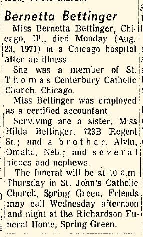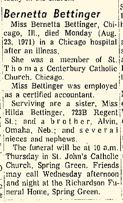 - Bernetta Bettinger b. 28 Dec 1889, d. 23 Aug 1971