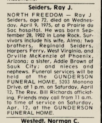 - [S373] U.S. Federal Census 1940 U.S. Federal Census, by Ancestry.com, Year: 1940; Census Place: Reedsburg, Sauk, Wisconsin; Roll: m-t0627-04523; Page: 10B; Enumeration District: 56-32A.