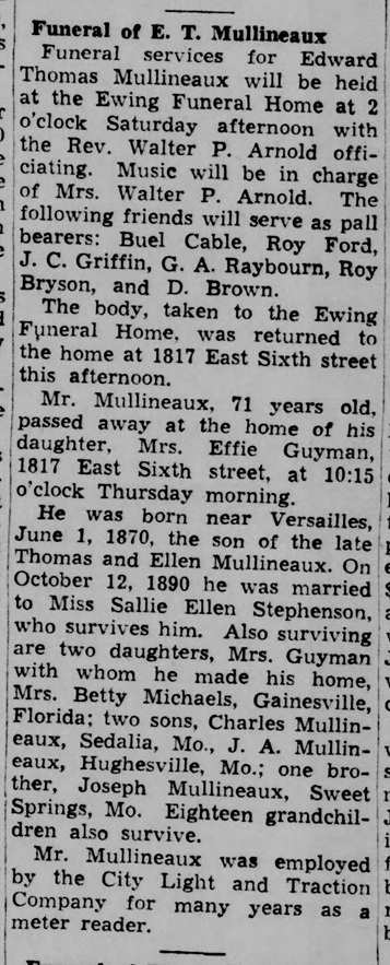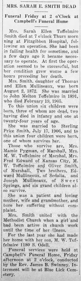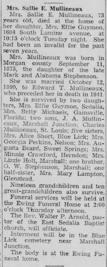 - [S373] U.S. Federal Census 1940 U.S. Federal Census, by Ancestry.com, Year: 1940; Census Place: Sweet Springs, Saline, Missouri; Roll: T627_2155; Page: 11A; Enumeration District: 98-34.