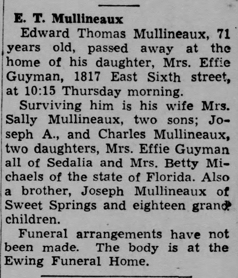 - [S243] U.S. Federal Census 1920 U.S. Federal Census, by Ancestry.com, Year: 1920;Census Place: Sedalia Ward 4, Pettis, Missouri; Roll T625_940; Page: 7B; Enumeration District: 155; Image: 442.