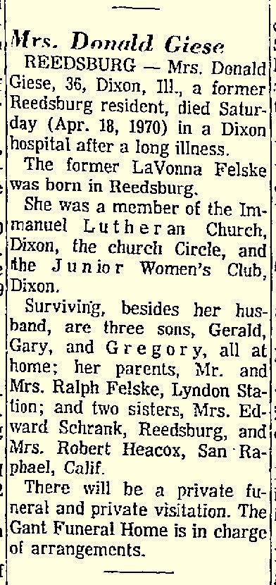 - LaVonna Felske+ b. 1934, d. 18 Apr 1970