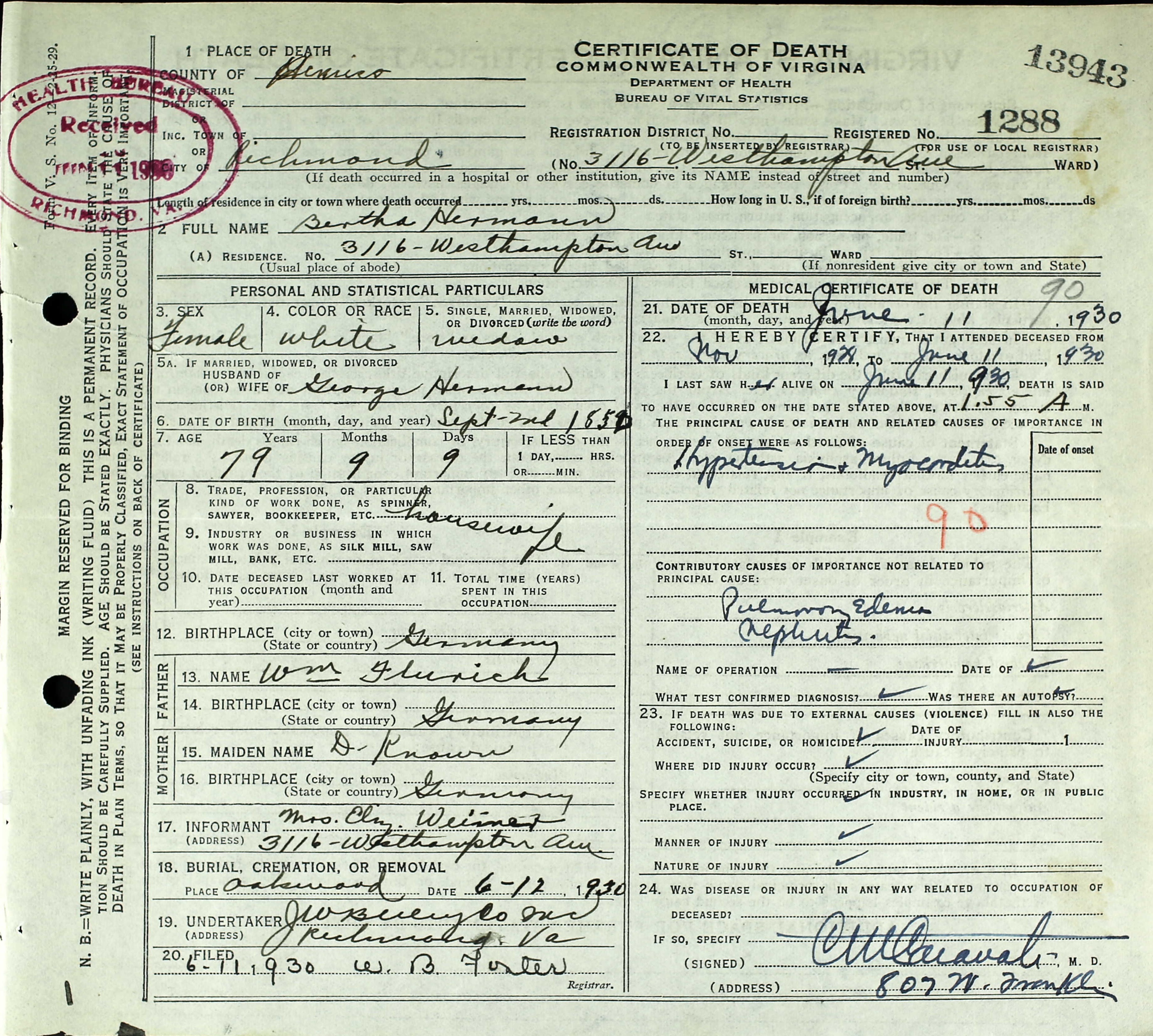 - [S243] U.S. Federal Census 1920 U.S. Federal Census, by Ancestry.com, Year: 1930; Census Place: Richmond, Richmond (Independent City), Virginia; Roll: 2477; Page: 2A; Enumeration District: 0039; Image: 456.0; FHL microfilm: 2342211.