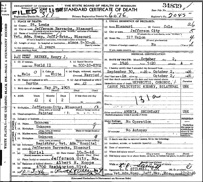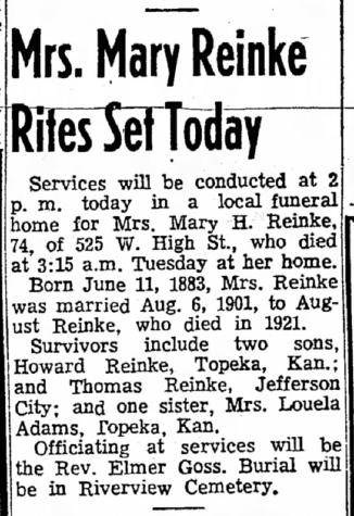- Henry James Reinke b. 29 May 1905, d. 2 Oct 1946