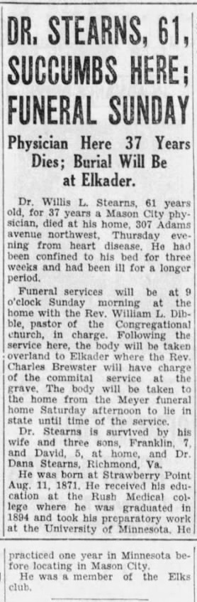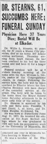 - Dr. Willis Leroy Stearns+ b. 11 Aug 1871, d. 15 Sep 1932