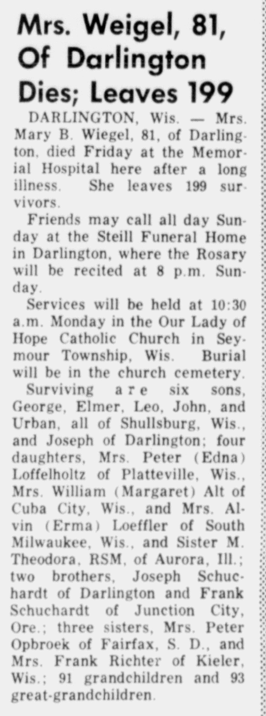 - George Joseph Wiegel+ b. 12 Oct 1906, d. 4 Sep 1990