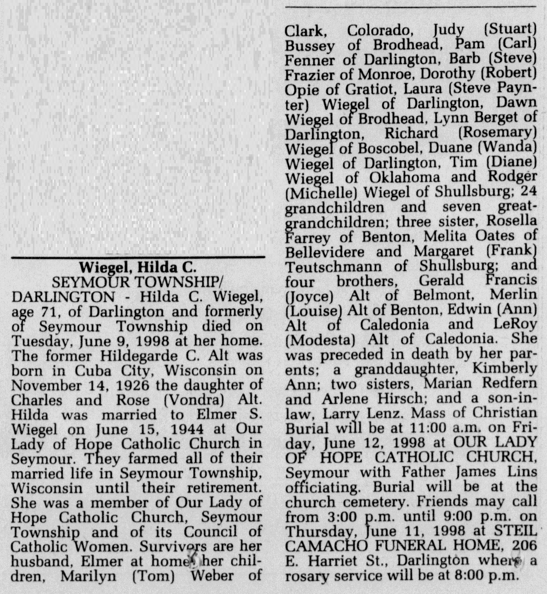 - Irma L. Wiegel b. 20 Nov 1924, d. 3 Nov 2020