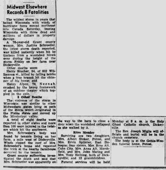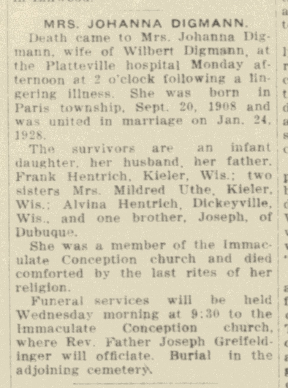 - [S243] U.S. Federal Census 1920 U.S. Federal Census, by Ancestry.com, Year: 1920; Census Place: Potosi, Grant, Wisconsin; Roll: T625_1988; Page: 3B; Enumeration District: 123; Image: 428.