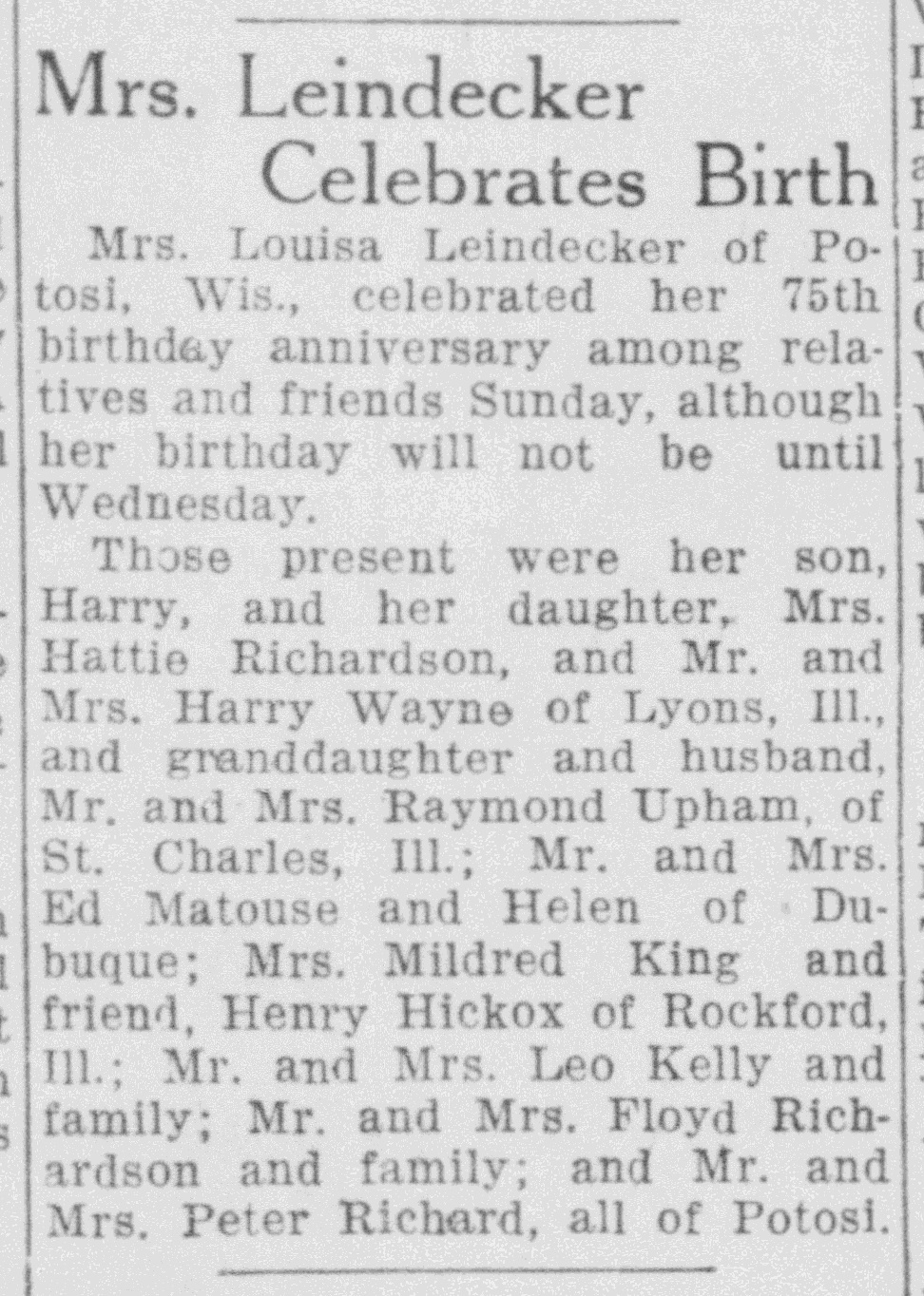 - Harry C. Leindecker b. 10 Aug 1893