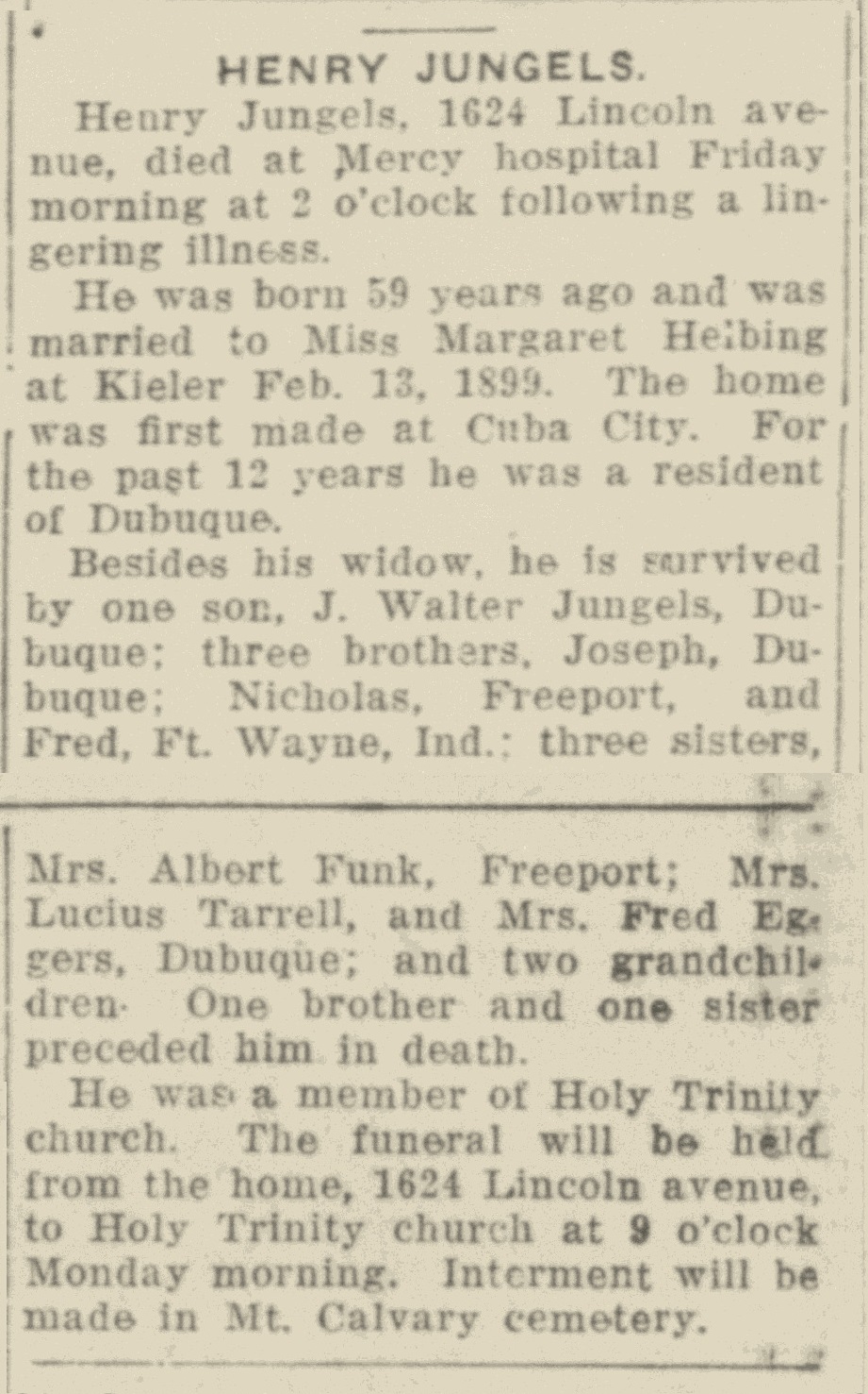 - Henry M. Jungels+ b. 1873, d. 2 Sep 1932