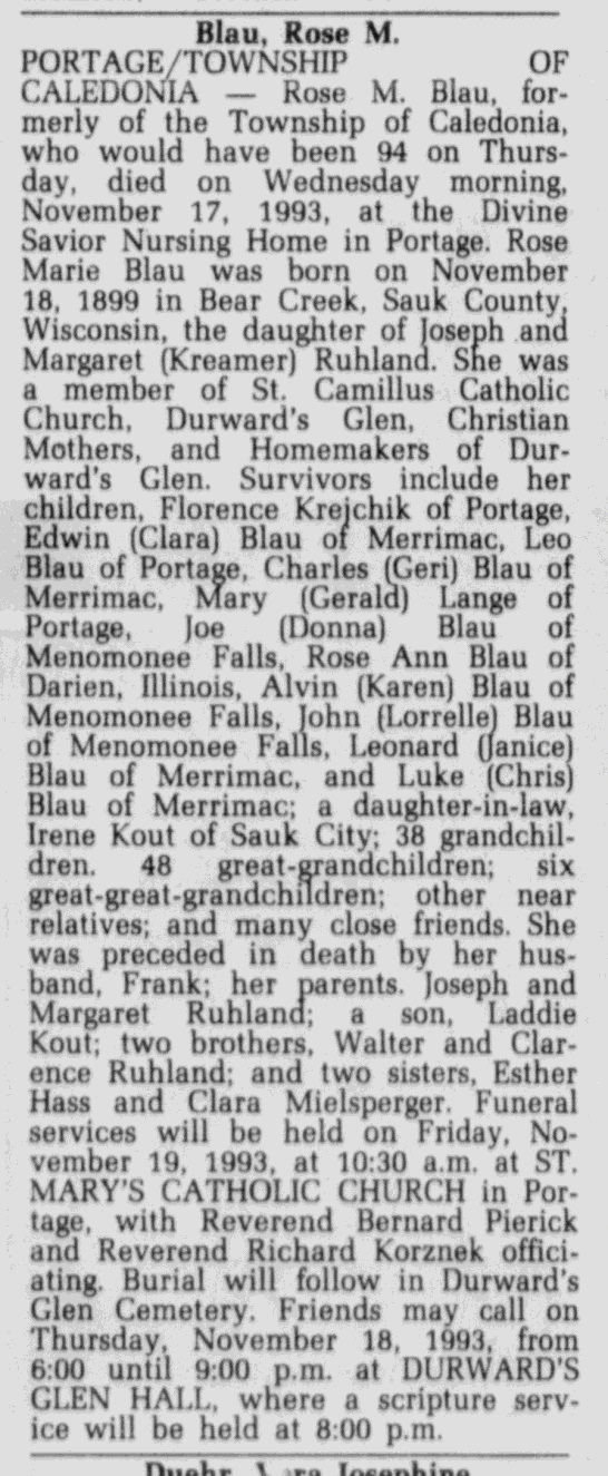 - [S373] U.S. Federal Census 1940 U.S. Federal Census, by Ancestry.com, Year: 1940; Census Place: Franklin, Sauk, Wisconsin; Roll: T627_4523; Page: 5B; Enumeration District: 56-14.