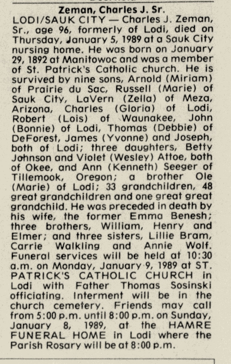 - Charles Joseph Zeman+ b. 29 Jan 1892, d. 5 Jan 1989