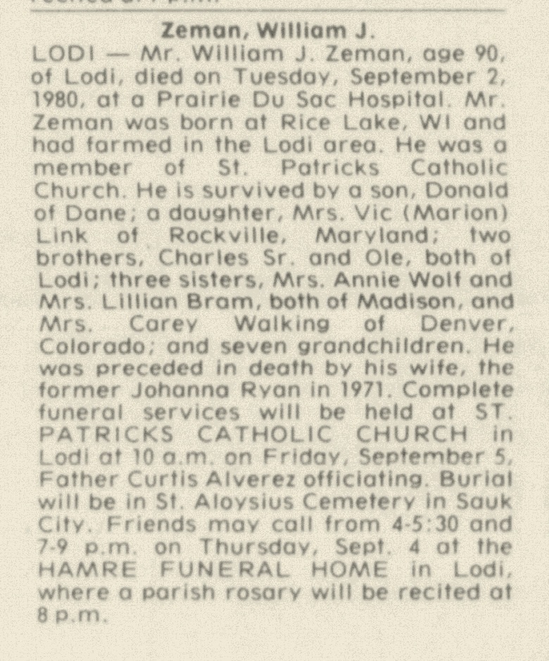 - William A. Zeman b. 21 Mar 1890, d. 2 Sep 1980