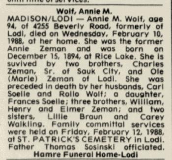 - Annie M. Zeman b. 15 Dec 1894, d. 10 Feb 1988
