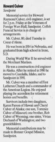 | Father* | Raymond John Culver b. 19 Apr 1893, d. 27 Jul 1981 |