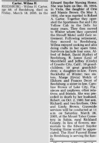 | Death | 18 March 2005 | Wilma H. Brown died on 18 March 2005 at age 88 Wilma (Brown) Carter obituary. |