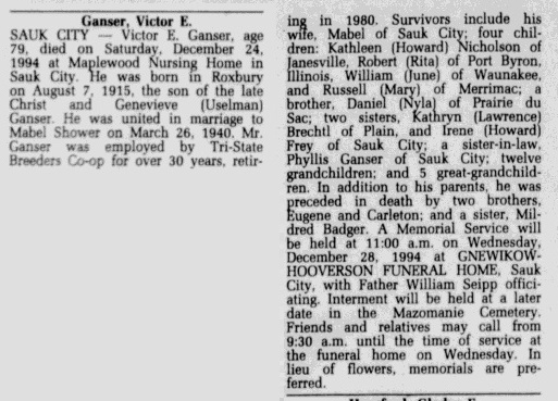 - Victor E. Ganser b. 7 Aug 1915, d. 24 Dec 1994