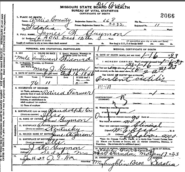 - James W. Guymon+ b. 16 Feb 1846, d. 16 Jan 1923
