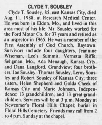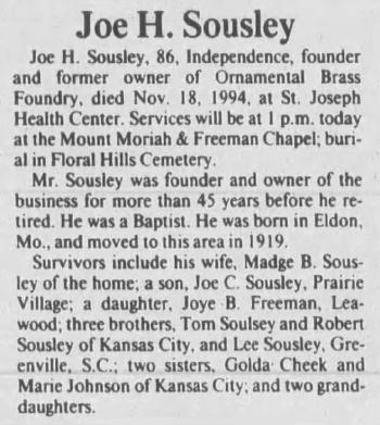 - Joe Carol Sousley b. 20 Mar 1932, d. 9 Aug 2009