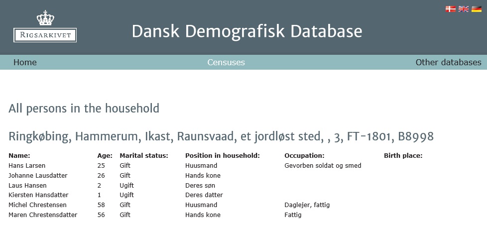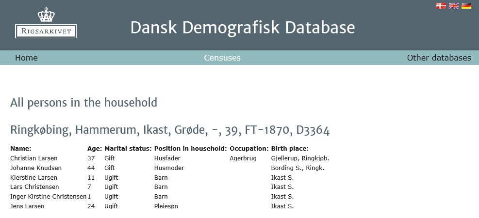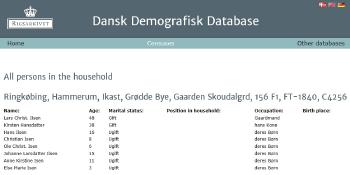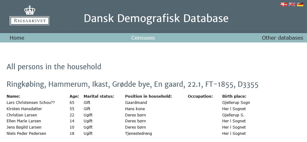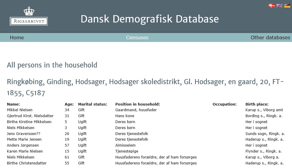 - [S384] The Danish National Archives; Census Records, Ringkøbing, Hammerum, Ikast, Grødde bye, En gaard, 23.2, FT-1855, D3355.