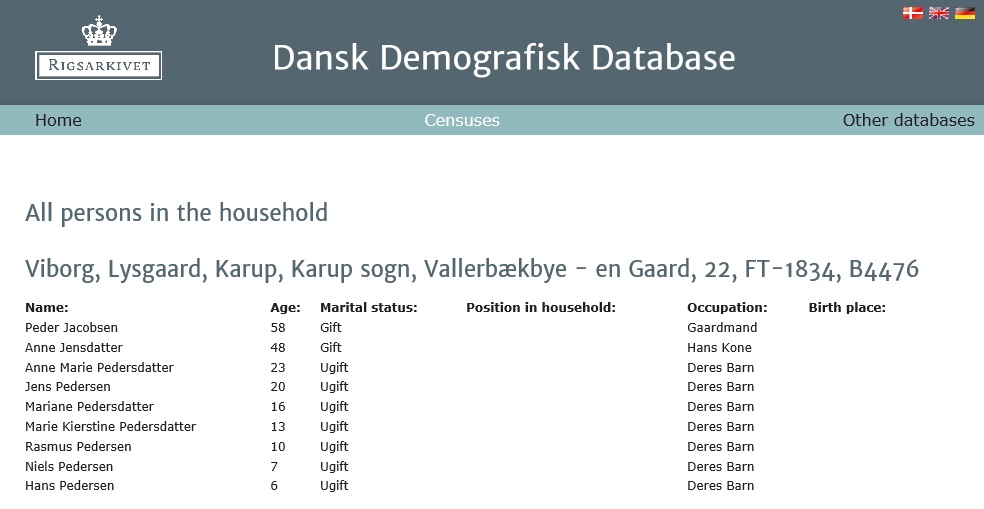 - [S384] The Danish National Archives; Census Records, 1834 Denmark Census - Viborg, Lysgaard, Karup, Karup sogn, Vallerbækbye - Peder Jacobsen.