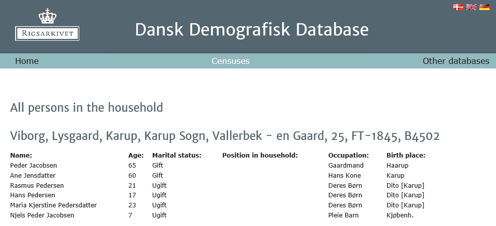 - [S384] The Danish National Archives; Census Records, 1845 Denmark Census - Viborg, Lysgaard, Karup, Karup Sogn, Vallerbek - Peder Jacobsen.