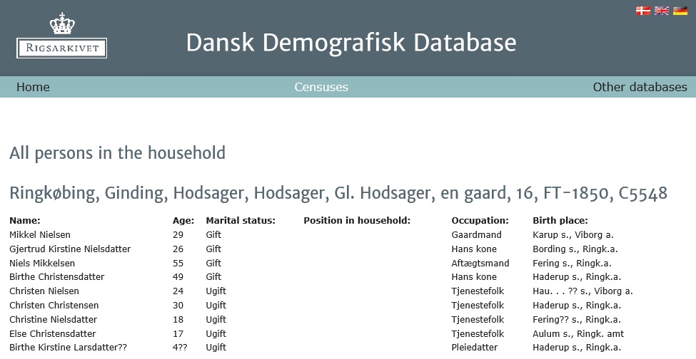 - [S384] The Danish National Archives; Census Records, 1850 Denmark Census - Ringkøbing, Ginding, Hodsager - Mikkel Nielsen.