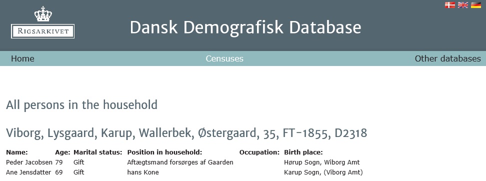 - [S384] The Danish National Archives; Census Records, 1855 Denmark Census - Viborg, Lysgaard, Karup, Wallerbek, Østergaard - Peder Jacobsen.