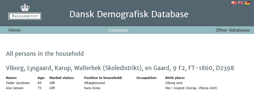 - [S384] The Danish National Archives; Census Records, 1860 Denmark Census - Viborg, Lysgaard, Karup, Wallerbek (Skoledistrikt) - Peder Jacobsen.