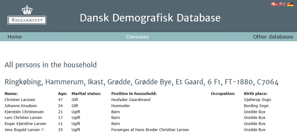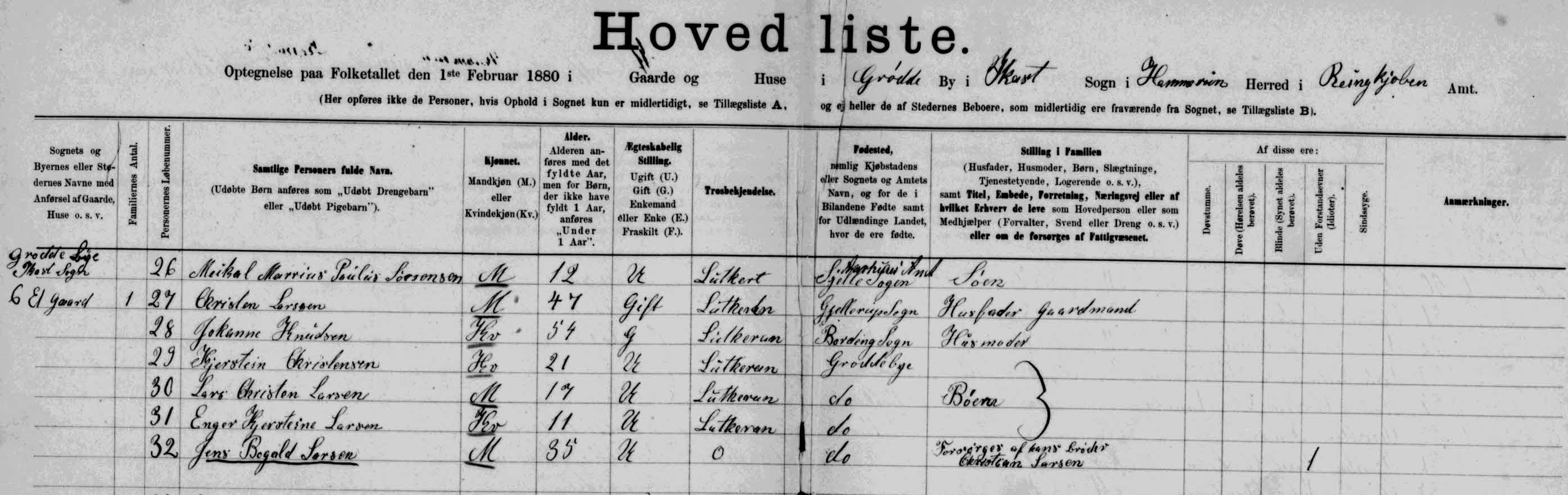 - [S384] The Danish National Archives; Census Records, Ringkøbing, Hammerum, Ikast, Grødde 1880.