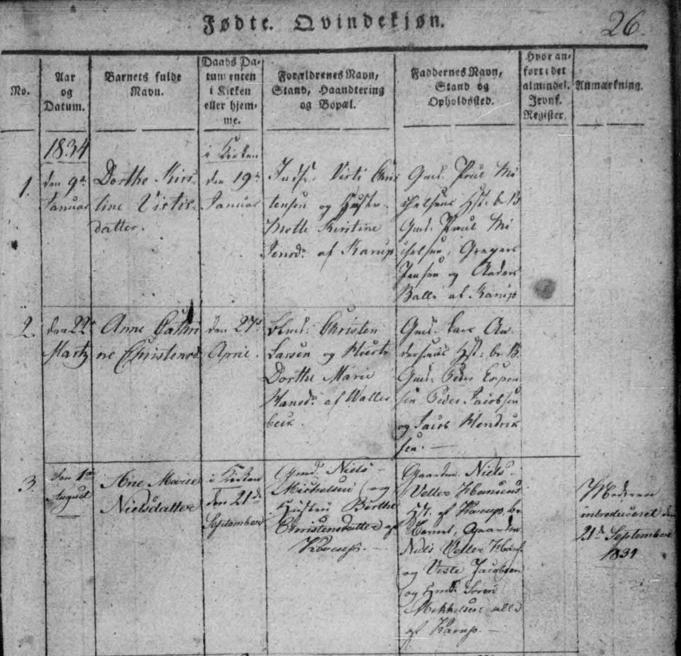 - [S383] The Danish National Archives; Church Records, Ane Marie Nielsdatter birth record, Page 26 Image 16, Karup sogn (Viborg amt) Kontraministerialbog (1814 - 2002) Denmark.