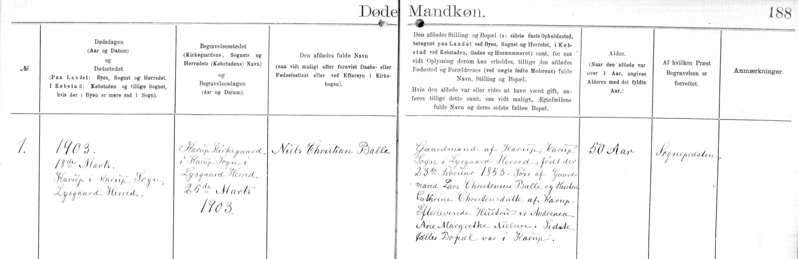 - [S383] The Danish National Archives; Church Records, Niels Christian Balle death record - 18 Mar 1903 - Karup, Lysgaard, Viborg, Denmark.