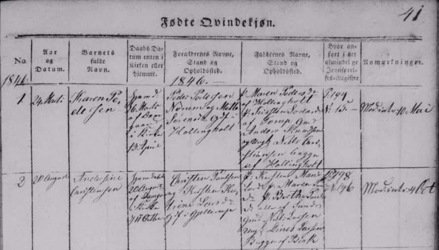 - [S383] The Danish National Archives; Church Records, Karen Pedersen birth record - 24 Mar 1846 - Sunds, Hammerum, Ringkøbing, Denmark.