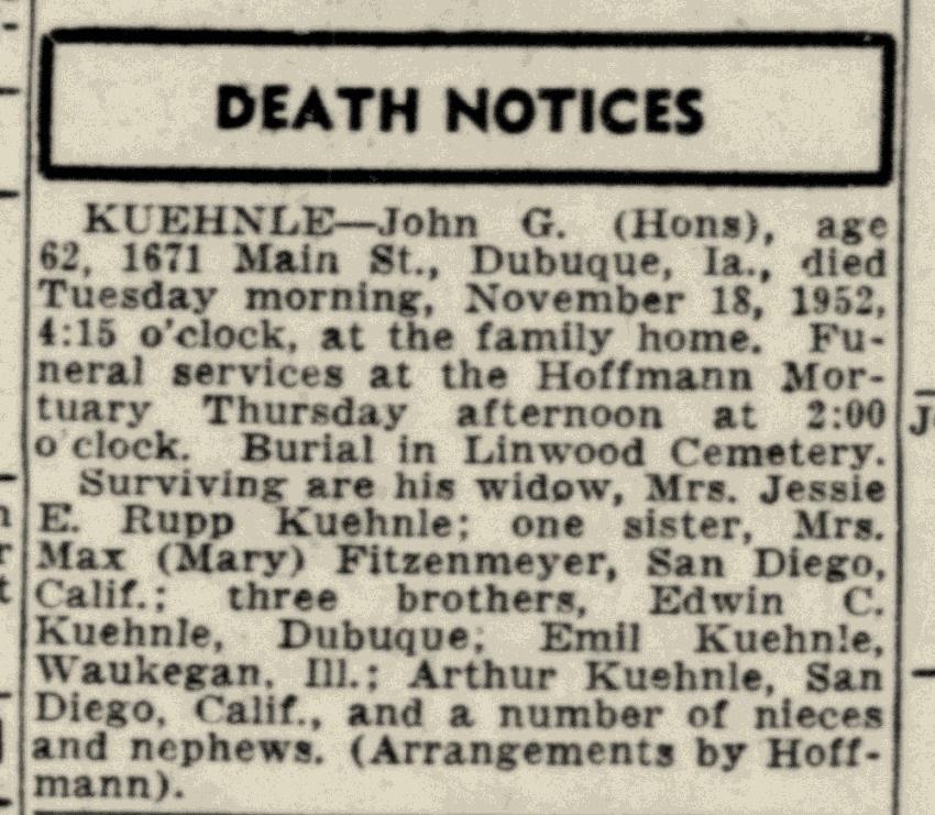 - [S250] U.S. Federal Census 1930 U.S. Federal Census, by Ancestry.com, Year: 1930; Census Place: Dubuque, Dubuque, Iowa; Page: 7B; Enumeration District: 0009.