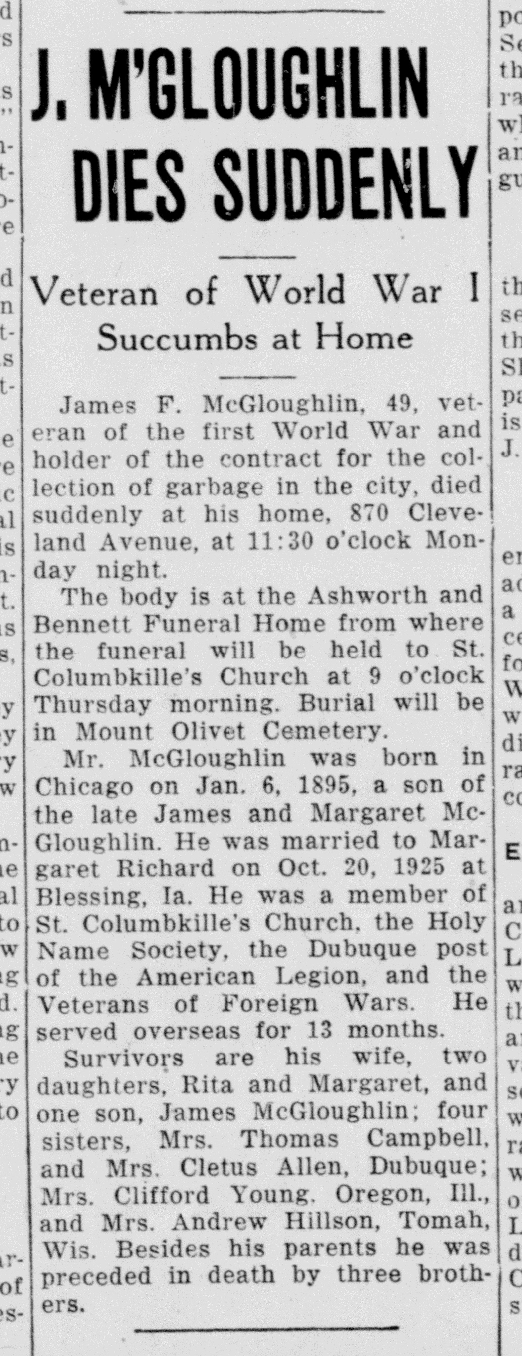 - James Richard McGloughlin b. 8 Jan 1928, d. 9 Jun 2013