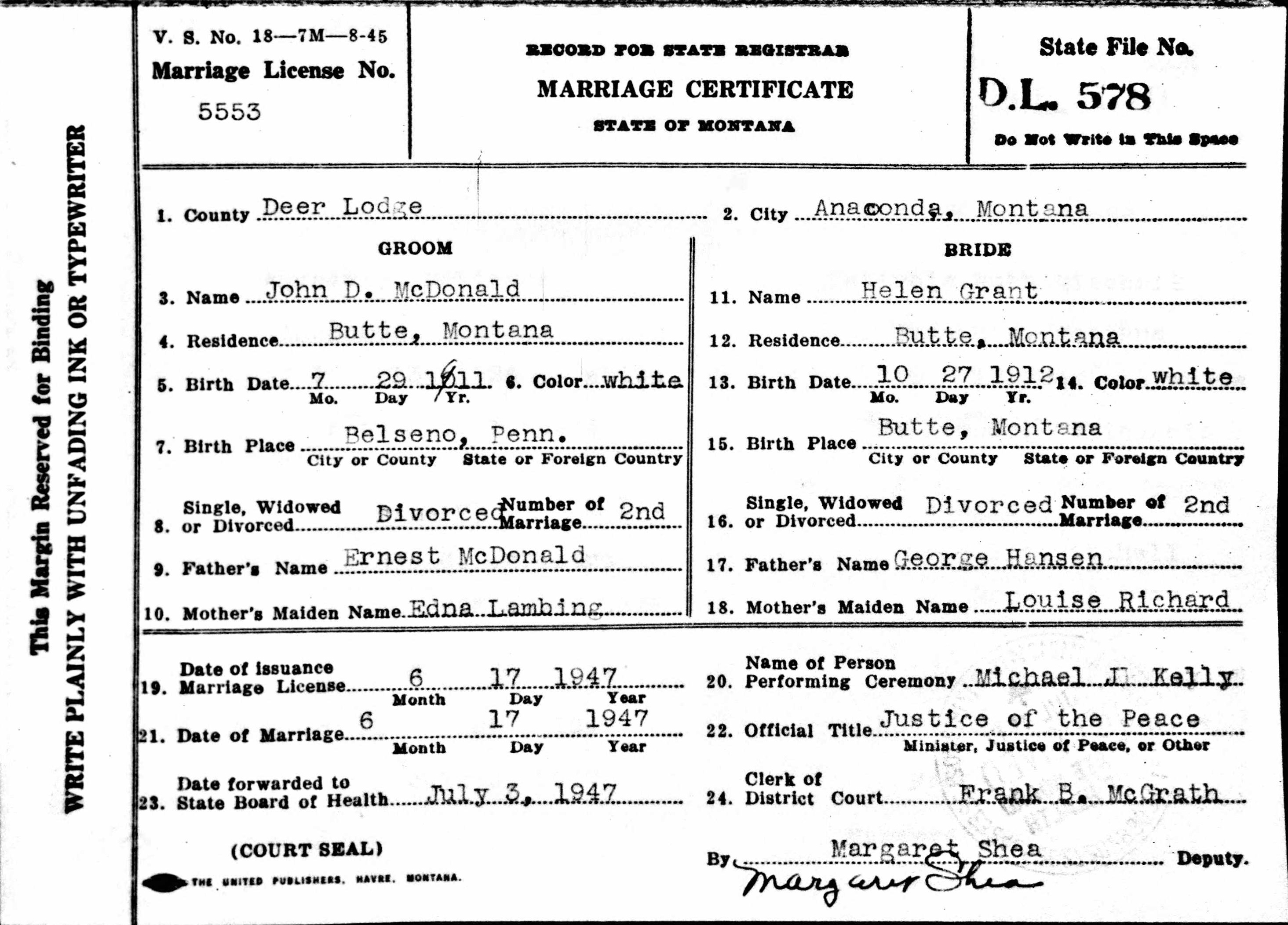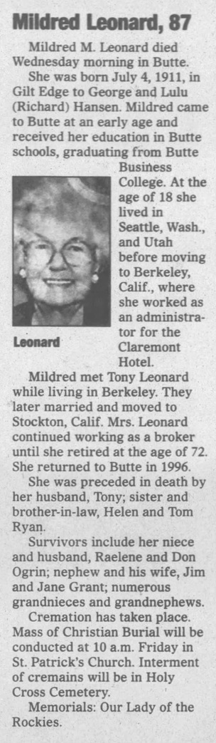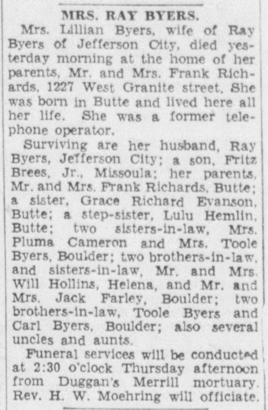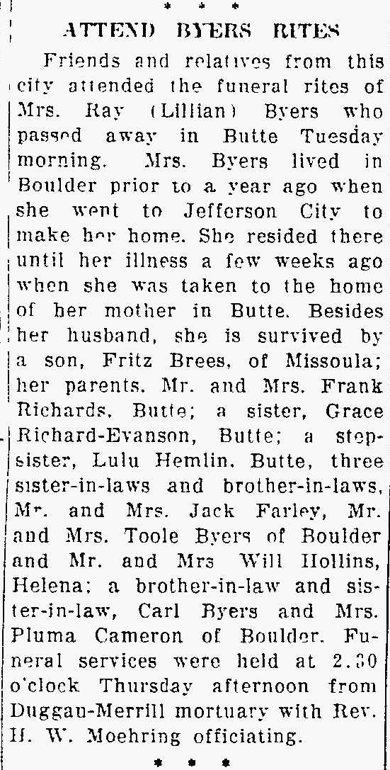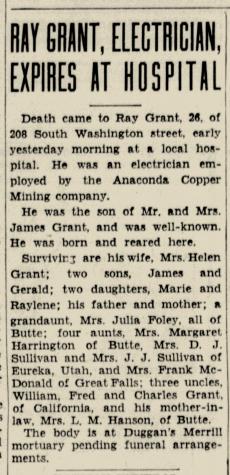 - [S250] U.S. Federal Census 1930 U.S. Federal Census, by Ancestry.com, Year: 1930; Census Place: Butte, Silver Bow, Montana; Page: 1A; Enumeration District: 0038; FHL microfilm: 2340997.